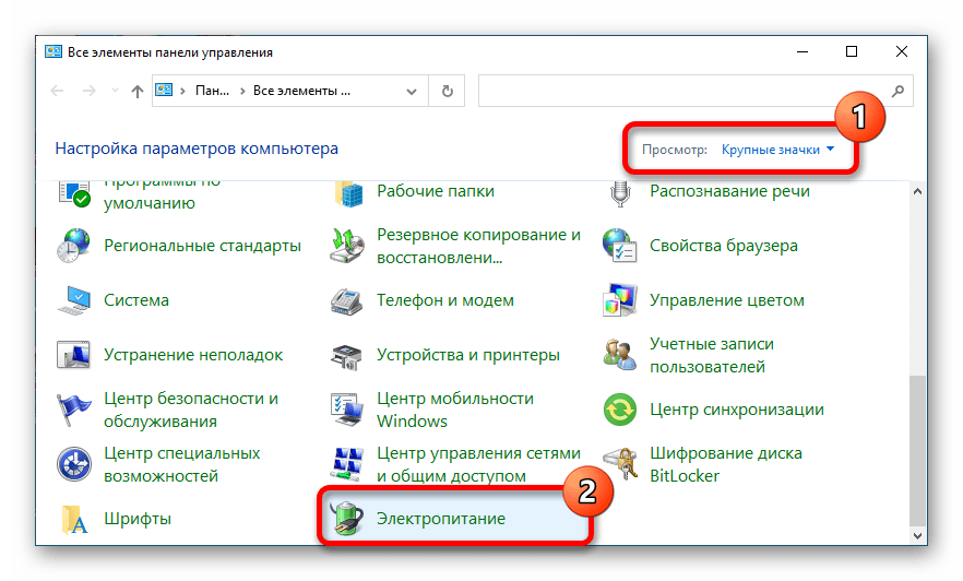 Выставьте режим просмотра основного меню панели «Крупные значки» и выберите пункт «Электропитание».