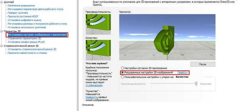 Обратите внимание на «Параметры 3D»: перейдя туда жмите на «Регулировка настроек изображения». После этого перейдите на «Пользовательские настройки с упором на» и потяните ползунок в сторону максимальной производительности