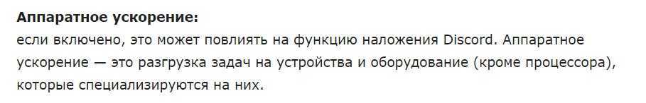 Как оказалось, приложение попросту начинает использовать ресурсы GPU, что положительным образом сказывается на качестве изображения. Но при этом увеличивается нагрузка на компоненты компьютера, и в основном на видеокарту. В результате, если ПК не слишком мощный, могут появиться ошибки и проблемы с запуском Discord. Нередко включенная опция приводит к серьезным сбоям, устранить которые помогает только переустановка софта.