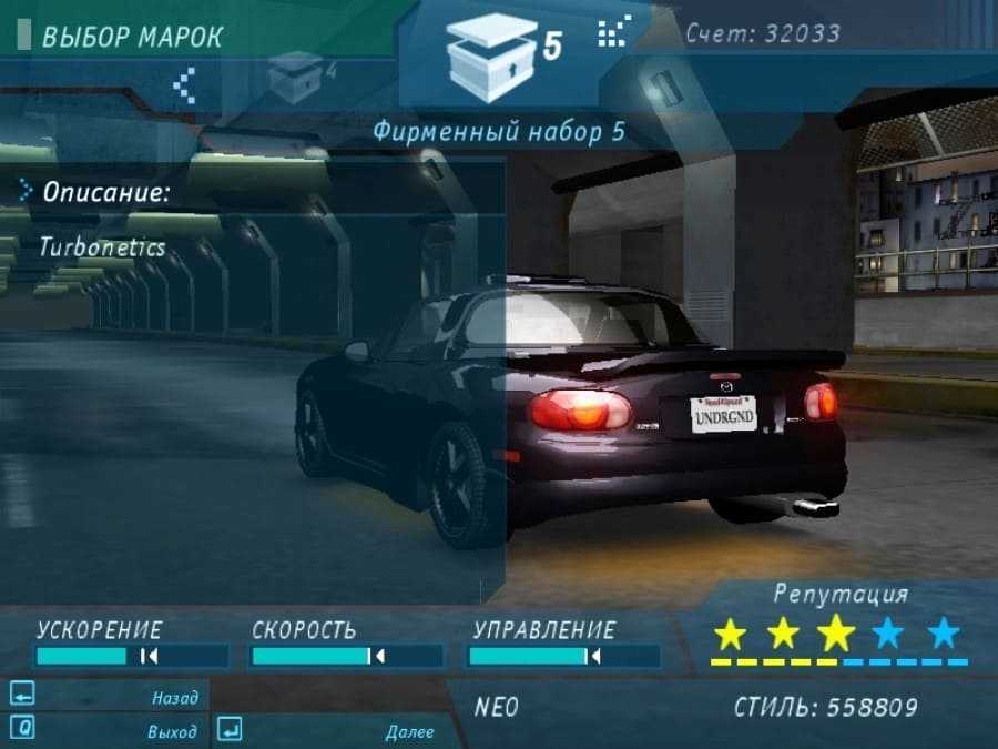 В режиме Underground все улучшения производительности и большинство визуальных улучшений (за исключением рисунка на машине, цвета, наклеек) имеют цену. В режиме Быстрой гонки любые улучшения производятся бесплатно.