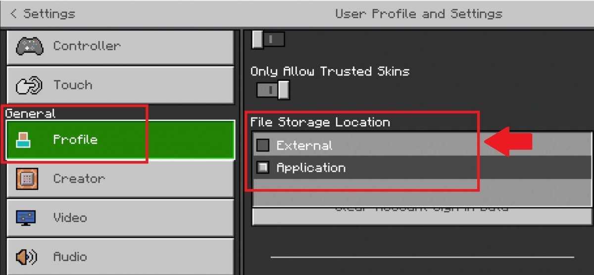 Оказавшись там, прокрутите меню слева, пока не дойдете до профиля (или профиля), и прокрутите вниз правую часть экрана, пока не найдете вкладку «Место хранения файлов». Убедитесь, что установлен флажок «Внешний» вместо Приложения, чтобы было ясно, что файлы сохранения и миры будут записаны на ваш телефон, а не в самой игре.