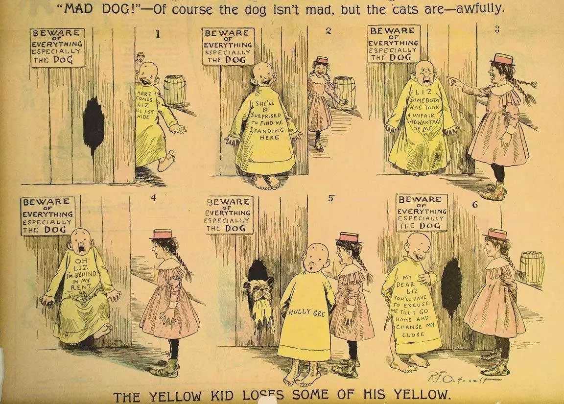 Одним из самых известных комикс-персонажей того времени был «Желтый малыш» (1896) (Yellow Kid), на плаще которого авторы писали диалоги и практически весь остальной текст.