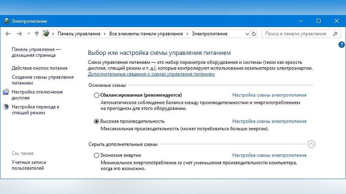 - Перейдите в «Панель управления компьютером» и выберите раздел «Электропитание». Затем отыщите режимы работы PC и поменяйте параметр на «Производительный».