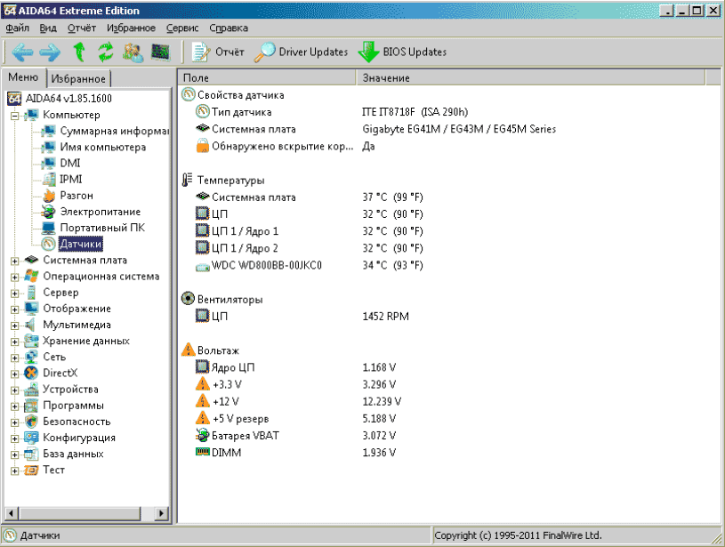 В подразделе Датчики раздела Компьютер находится наиболее важная информация. Здесь вы моете посмотреть температуру ЦП и видеокарты, а также узнать состояние работы других устройств. Например, если температура процессора превышает планку в +70 градусов, стоит задуматься о проверке ЦП или замене термопасты.