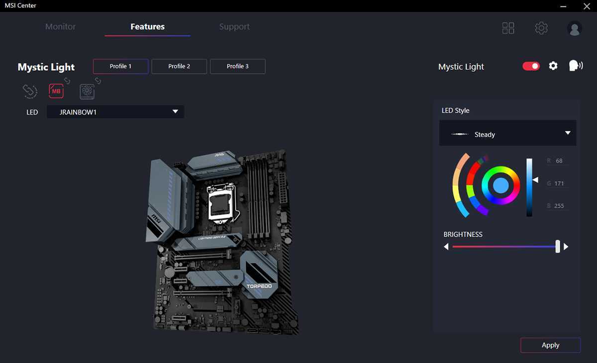 Именно такой контроль дает вам в руки приложение MSI Mystic Light. С его помощью регулируется вся подсветка, от материнской платы до светодиодных лент, при этом интуитивно понятный интерфейс позволяет без малейших усилий настроить даже очень сложные визуальные эффекты.