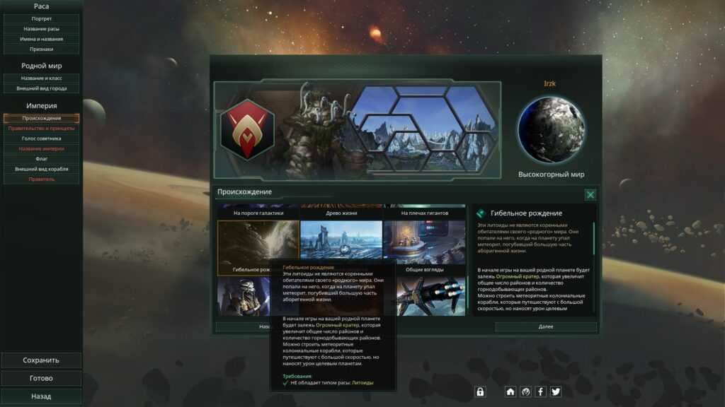 Первое заметное нововведение ждёт игрока уже на этапе создания новой империи – введена система происхождений, позволяющая существенно варьировать стартовые условия. Например, можно начать игру на секции разрушающегося мира-кольца, быть вассалом угасшей империи или же вовсе стать расой, живущей в космических средах обитания по аналогии с мародерскими империями из Apocalypse. Балансом, надо признать, здесь и не пахнет, некоторые происхождения дают чрезвычайно мощные бонусы, в то время как другие скорее дебафают. Тем не менее, открываются довольно широкие возможности ролевого отыгрыша.