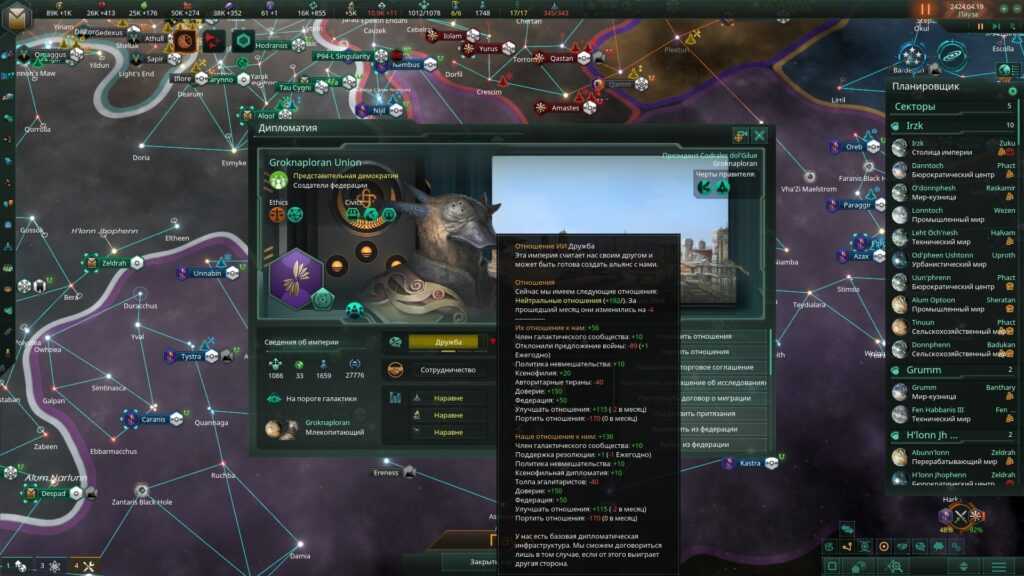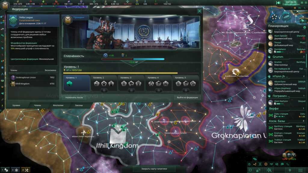 Существенное изменение претерпели федерации. Отныне это больше не исключительно военные союзы, политика внутри которых сводится к голосованию «за» или «против» объявления очередной войны. Во-первых, самих федераций теперь несколько видов: от научного объединения до гегемонии, каждая из них предлагает какие-то свои бонусы для всех своих членов. Во-вторых, внутри федерации появляется политическая жизнь и даже интриги, реализуемые через законы федерации. Имея значительное влияние, можно неспешно централизовывать федерацию, постепенно превращая своих союзников в фактически подданных!