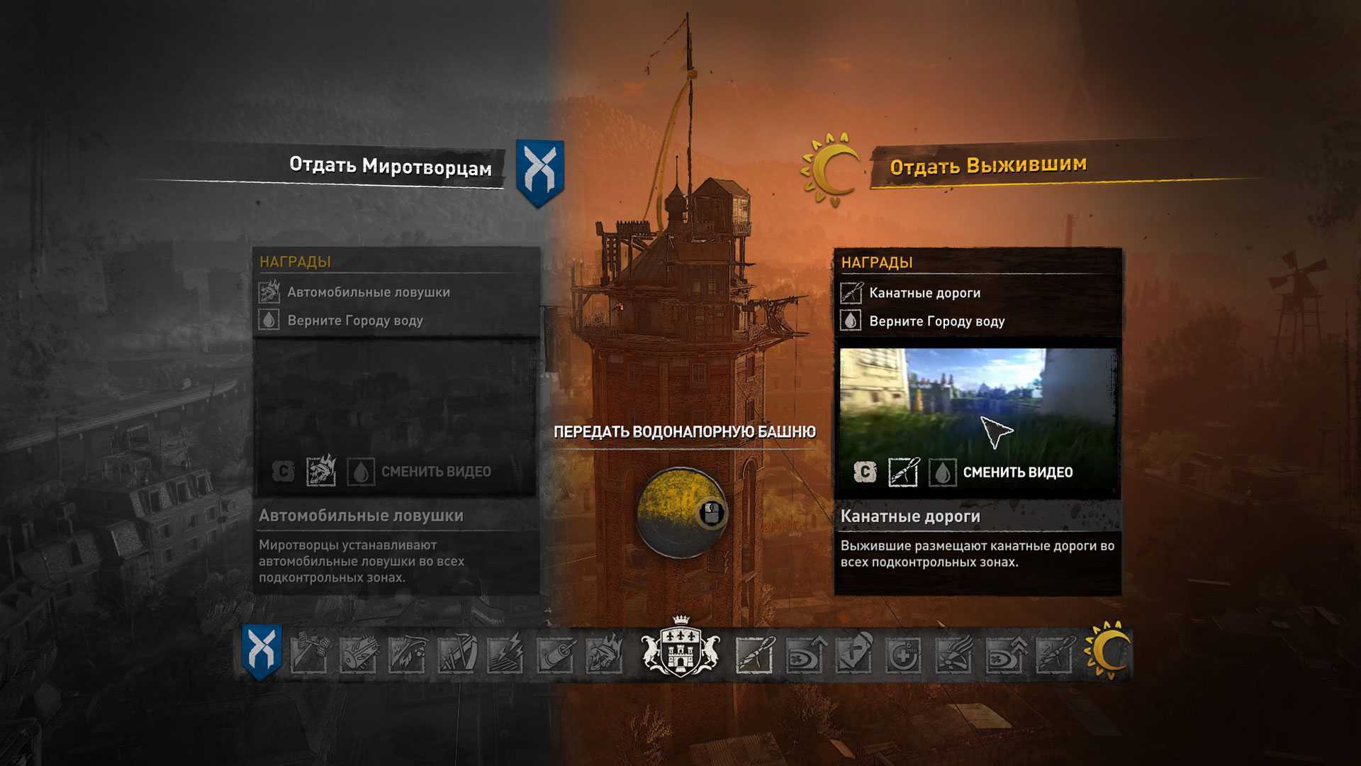 Выбор между фракциями весьма условный и, за рамками конкретных сюжетных миссий, практически никакого влияния на повествование не имеет. На карте есть несколько точек водоснабжения и электростанции. В зависимости от того, кому и в каком количестве мы отдадим эти важные точки и, соответственно, контроль над территорией, в городе появятся новые приспособления для паркура (это если отдадим голос за Выживших) или начнут появляется новые способы умерщвления зомби и противников (если встанем на сторону Миротворцев).