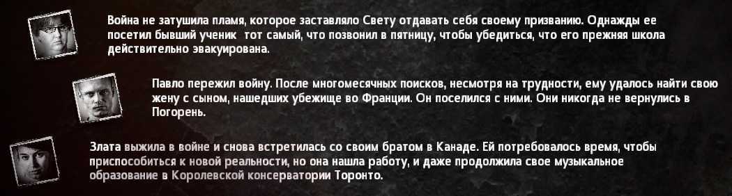 Обычно в таких проектах принято не обращать внимания на количество полигонов в ухе третьего слева статиста, но сегодня автор не в настроении делать скидки на небольшую студию и малый бюджет (сами виноваты, делая такую мрачную игру). Дело в том, что в отдалении все выглядит настолько одинаково серо и, простите, «скопипастенным», что часто путаешься. Это в некотором роде навязывается общей идеей (война, как никак), но даже персонажей часто трудно отличить друг от друга! Чего, впрочем, не скажешь об их фотографиях. Снимки чем-то напоминают знакомую всем игру Мор. Утопия, создавая нужную атмосферу. Да и вообще, если говорить о схожести, This War of Mine больше всего напоминает именно этот отечественный проект.