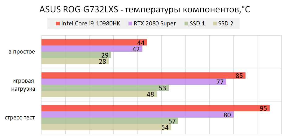 Видно, что максимальная температура видеокарты не поднимается выше 80 ° C, а процессора – выше 95° C, после которых идёт искусственное снижение частоты. Процессор нагревается достаточно сильно, но для Intel Core i9-10980HK такие температуры ожидаемы (не забываем про максимальное TDP 45 Вт). Причём это ещё не самые пугающие температуры по больнице: в ROG Scar 17 G732LXS ASUS применили продвинутую технологию термоинтерфейса — жидкий металл. Именно это позволило поднять максимальные частоты и частично сбить температуру под нагрузкой.
