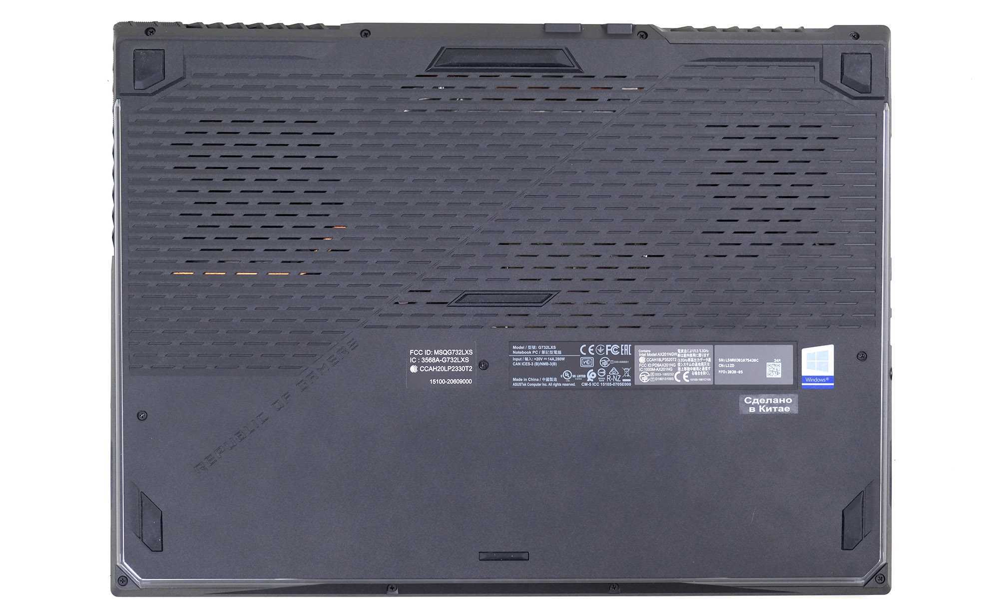 Снизу на корпусе есть несколько масштабных решёток для забора воздуха и 6 невысоких резиновых ножек – для массивного ноутбука в самый раз.