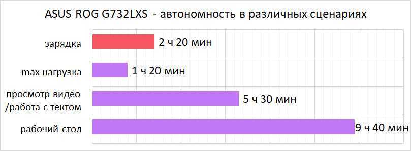 В режиме минимальной нагрузки ASUS ROG Scar 17 G732LXS смог прожить почти 10 часов – неплохой результат для игрового тяжеловеса. Спасает тут возможность переключаться на встроенную графику при малых нагрузках.