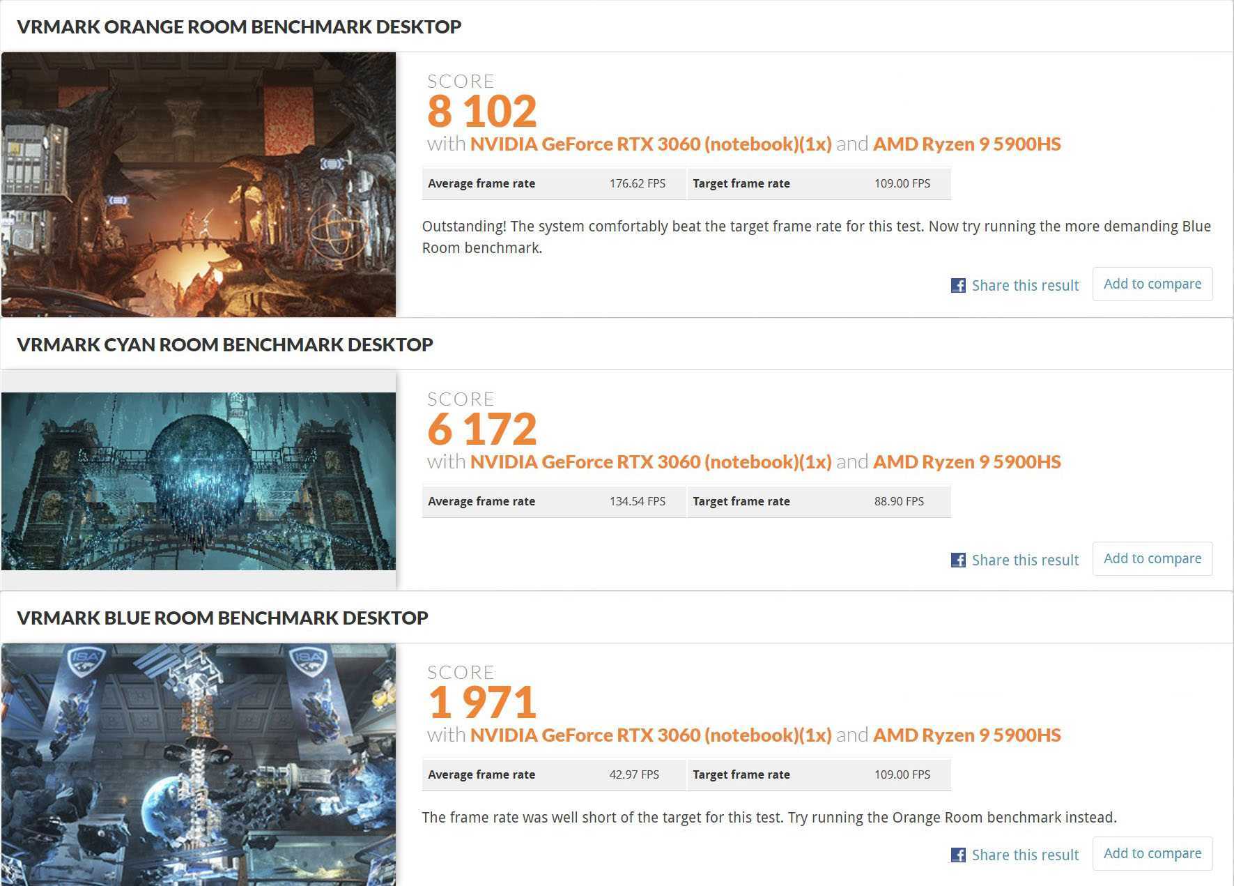 В тестах VRMark также обнаруживает хороший уровень производительности, только в BLUE ROOM средняя частота кадров оказалась не слишком высокой – около 43 FPS.