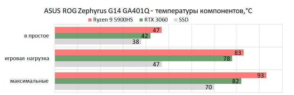 Процессор, обладая TDP 35 Вт, разогревается под стрессовой нагрузкой до 87° C, максимальные пиковые значения — 93° C. В играх температура держится в пределах 75-85° C в среднем, что ожидаемо – Ryzen 9 5900HS всё-таки достаточно горячий для узких корпусов. Тем не менее, троттлинга замечено не было.