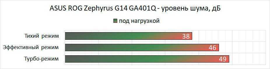 Производительные комплектующие предполагают высокое тепловыделение и мощную систему охлаждения, которая в теории будет более шумной. У Zephyrus G14 GA401Q получилось минимизировать шум. В турбо-режиме это порядка 49 дБ – много, но ожидаемо для игровых ноутбуков 14”. При этом в стандартном режиме («эффективный») шум на порядок меньше – 46 дБ, а в тихом уровень вполне комфортный – не больше 38 дБ. Эти цифры были получены только под нагрузкой; в простое система охлаждения работает почти неслышно.