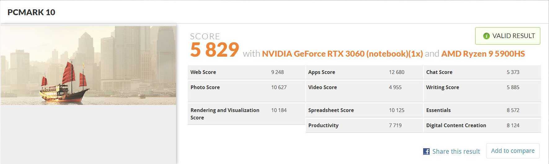 В PCMark 10 получаем высокий балл — заслуга быстрой дисковой системы и 8-ядерного процессора Ryzen 9 5900HS.