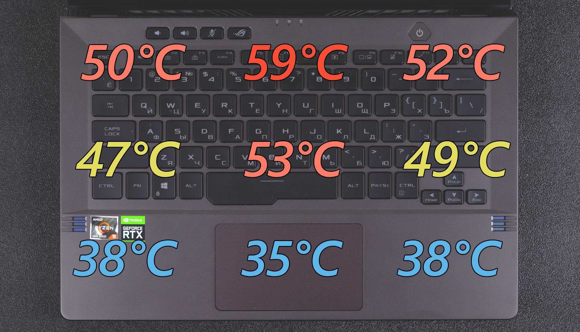 Металлический корпус и производительное железо в нём делают Zephyrus G14 GA401Q довольно горячим и внешне – на поверхности топкейса максимально мы зафиксировали 59 ° C. При этом область вокруг тачпада прогревается не так сильно, нагревается в основном дальняя часть топкейса.