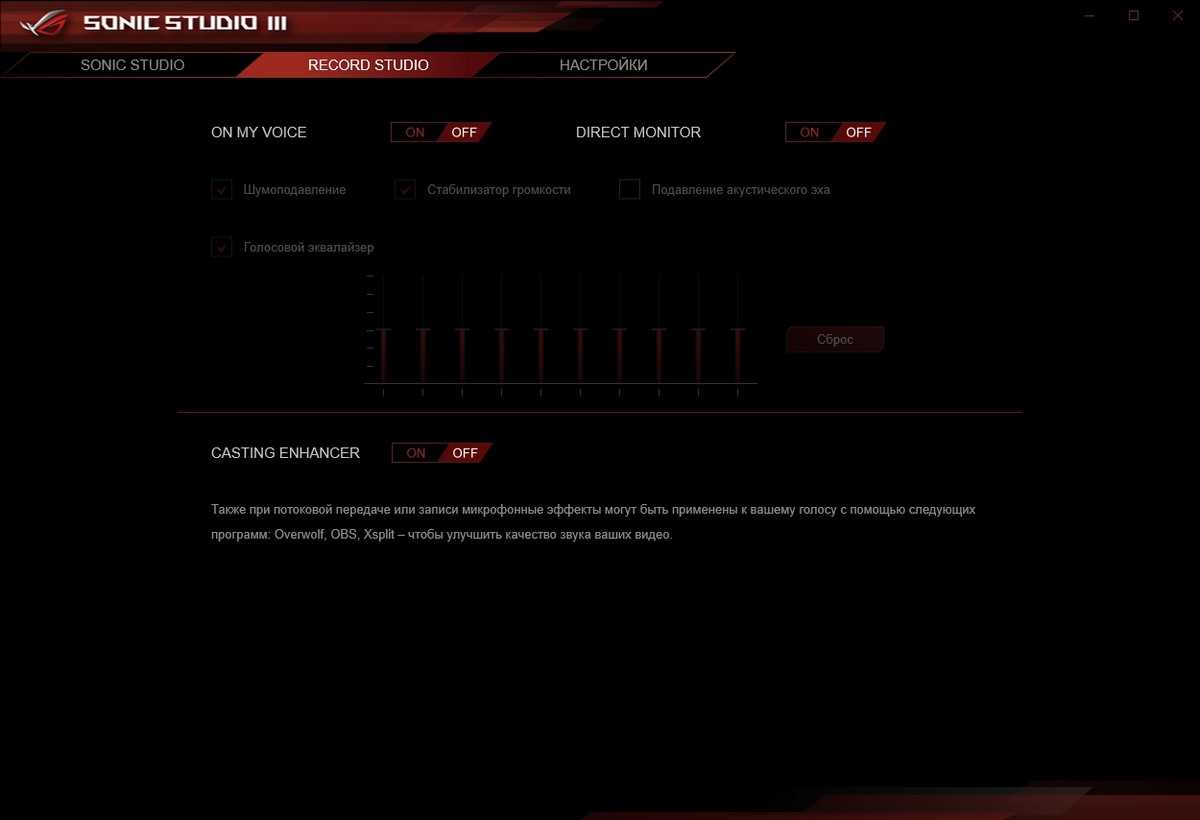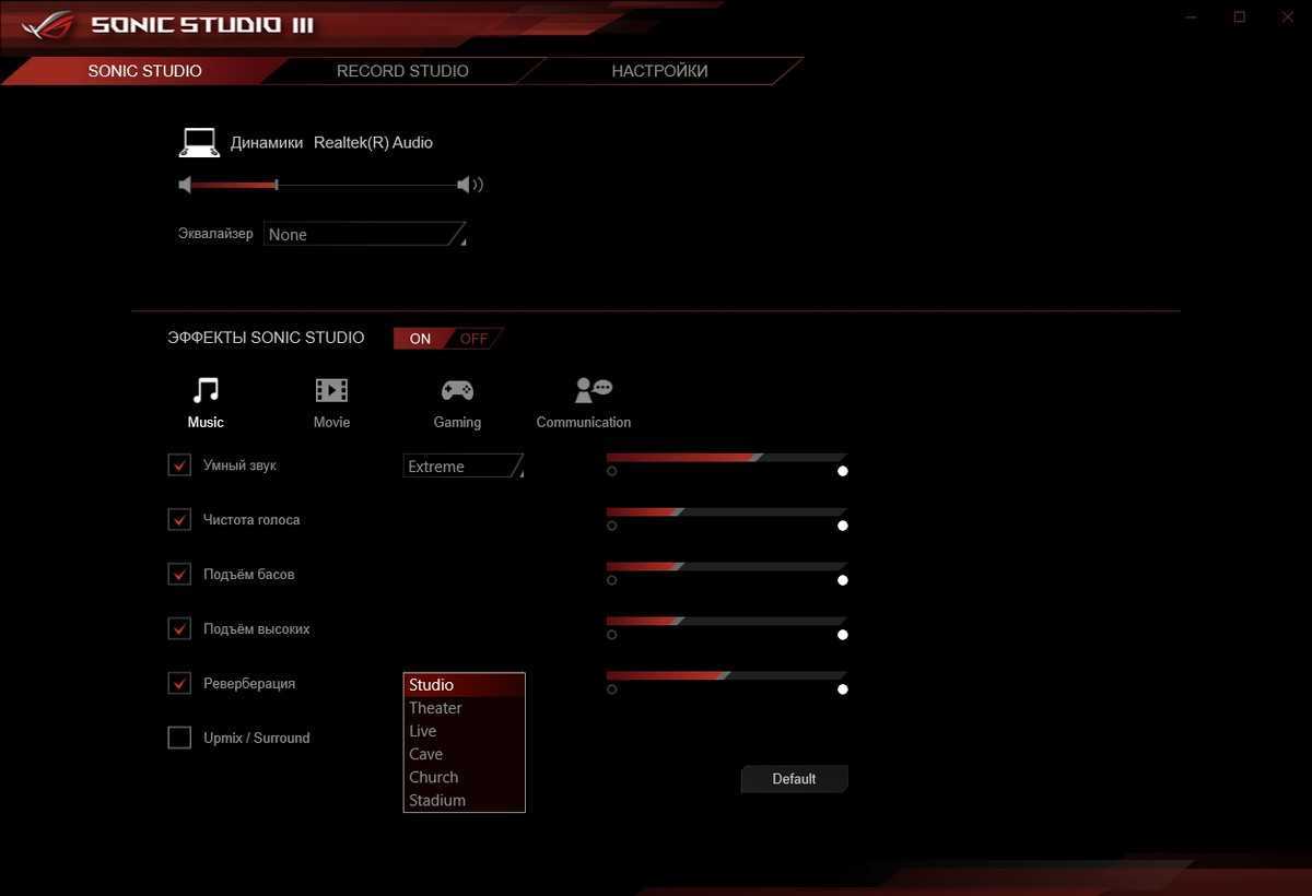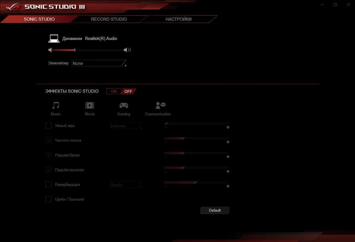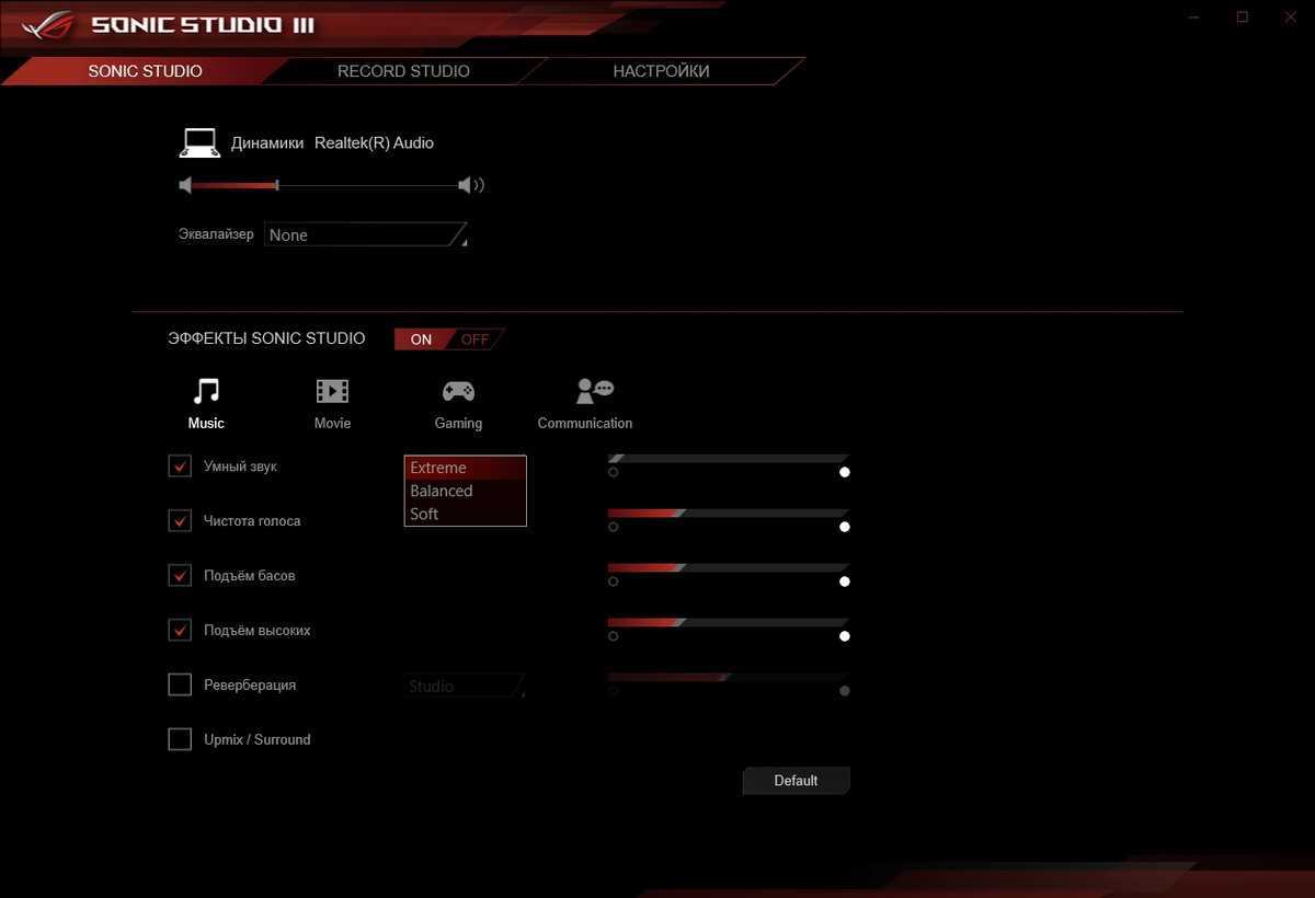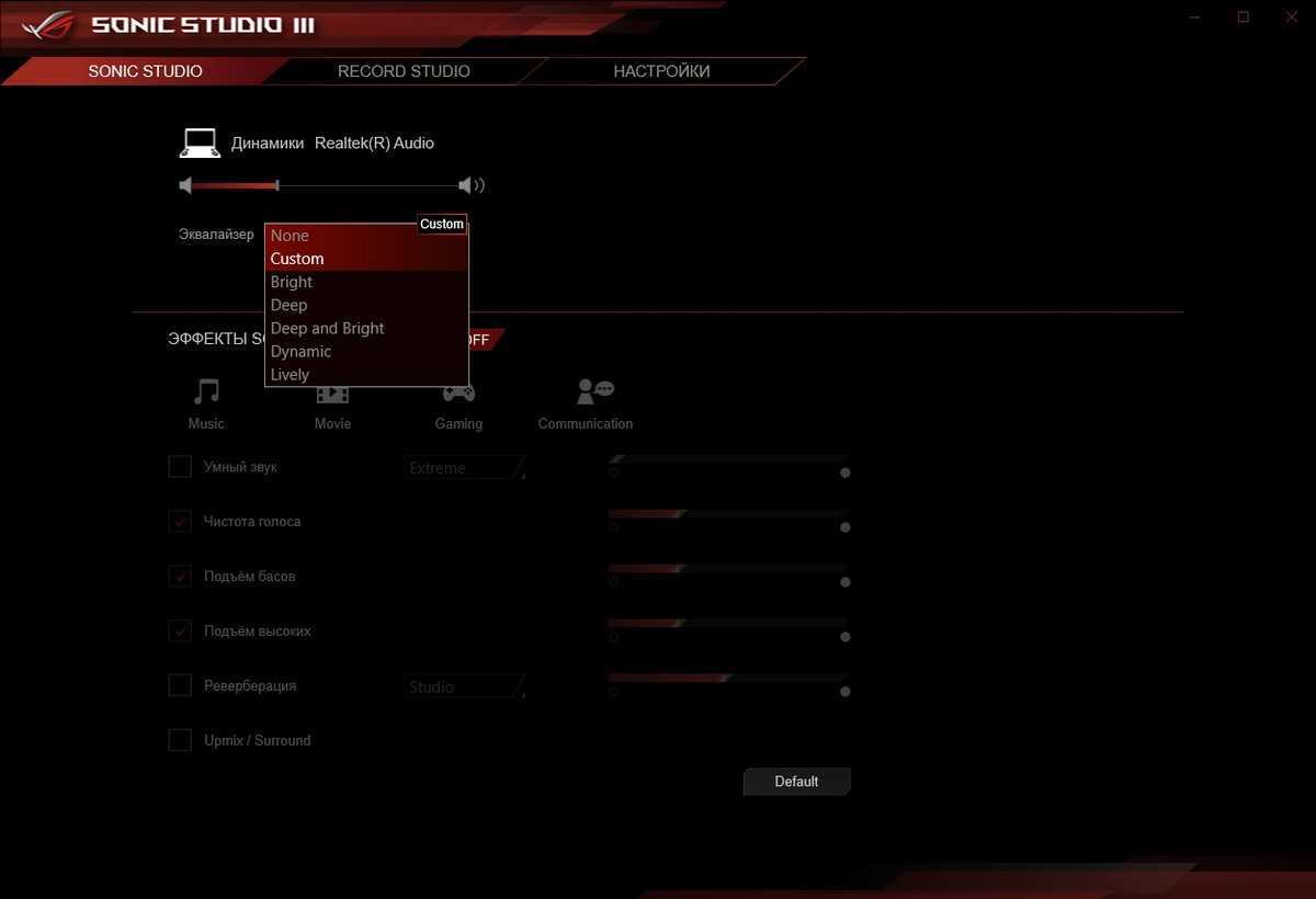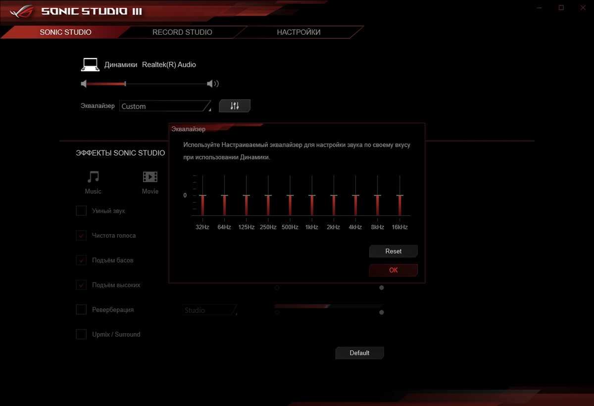 Немного подкорректировать звучание можно в утилите Sonic Studio. Здесь есть эквалайзер, отдельные профили и некоторые регулируемые эффекты. То есть как-то подогнать звучание под себя можно, если что.