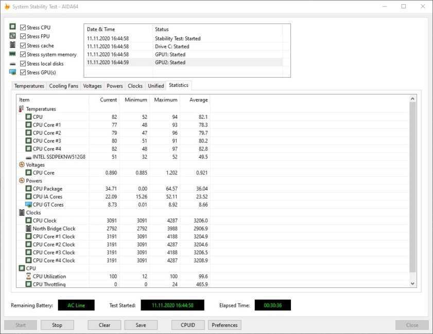 Всего режима три: тихий, эффективный и турбо. При желании можно вернуться на типичную систему управления питанием Windows. Дальнейшие тесты, разумеется, проводились при подключенном адаптере питания. В утилите AIDA64 был выбран тест стабильности, каждый прогон длился 30 минут.