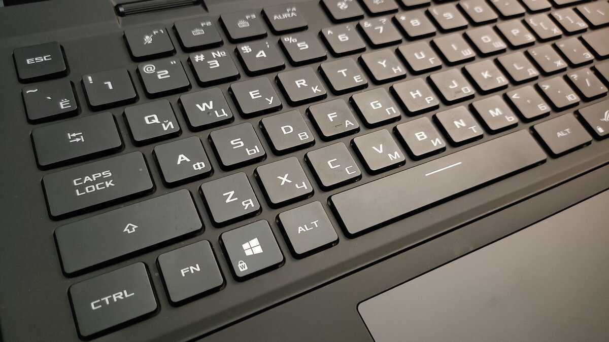 Оптико-механические переключатели считаются наиболее продвинутыми среди клавиатурных свичей, они используют луч света для регистрации нажатия. Это дает ускоренный отклик в 0,2 мс и ресурс в 100 млн нажатий. Клавиши нажимаются с приятным усилием, при этом чувствуется ощутимый клик. Клавиатура довольно тихая — намного тише, чем стандартная десктопная механика. Однако звук клавиш немного отличается, что в целом некритично. Разумеется, есть поклавишная подсветка Aura, полноразмерные стрелки, полноценный нампад и увеличенный тачпад.