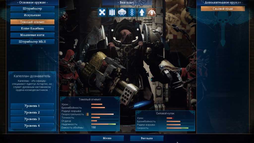 Самый полезный класс. Если вы делаете все правильно ни кого полезнее вас нет на поле боя. Даже апотекарий не играет такой большой роли в группе.Доспех:-20% восстановления литания войны-50% урон от кислоты20% усиление доспехаОружие:Тяжелый огнемет: модуль надежности, высокоемкая обоймаСиловой кулак: увеличение скоростиУмение: лидерИ так, чем же так полезен капеллан? Наверное стоит для начала в целом описать на что он похож. Капеллан это лидер, он как асфальтоукладчик прокладывает путь вперед, ни что не устоит на его пути. Он может штурмовать что угодно и при этом все время помогать своей группе.Теперь более подробно. Начнем с оружия. Огнемет – странное оружие. Вы будете сжигать целые орды ксеносов, в одиночку укладывать босса, а в конце катки вас будет ждать скромная серебряная медаль за урон. Даже у апотикрия будет написано больше урона. Это баг статистики, там видимо учитывается только первый тик или первый пораженный противник. Но по факту огнемет на втором месте по урону из всего оружия. Теперь как им пользоваться: огнемет бьет струей насквозь через всех противников. Сгорают ксены довольно быстро, однако стагерятся плохо, это не так как из Адского пламени по этому нужно быть предельно аккуратным что бы не словить оверхед от летящего в вас трупа. Всегда двигайтесь по диагонали или зигзагом если вы в коридоре или трубе. На открытой территории закручивайте врагов по кругу. Лучше отвести урон в руки чем в центр туловища. При работе с огнеметом вам понадобятся те же навыки что с Адским пламенем, в струе огня ни чего не видно, по этому вам нужно поглядывать на радар что бы понимать умерли ли ксены или еще прут. А теперь как убивать боссов из огнемета? давайте сначала рассмотрим самих боссов, а их по факту два типа. Обычный, если рассматривать его визуально имеет более крупный верх, тараканью голову и короткий хвост.
