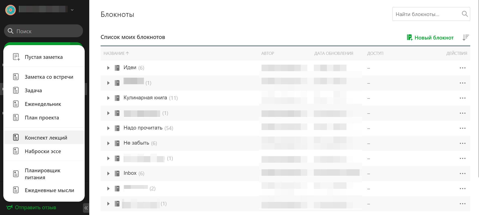 - создавать записи по шаблонам — еженедельник, план проекта, конспект лекций, планировщик питания и так далее;