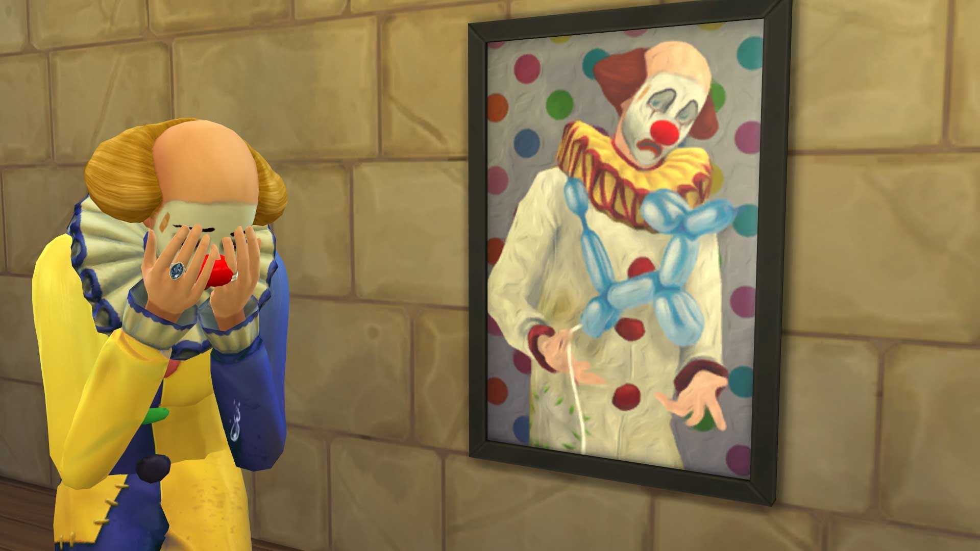 Трагический клоун уже давно существует во франшизе The Sims , начиная с самой первой игры. Это всегда появлялось в произведениях искусства и в невероятные времена, когда наши симы чувствовали себя одинокими и несчастными. Трагический клоун появляется в The Sims 4 в форме картины, которая окажет значительное эмоциональное воздействие на любого, кто решит посмотреть эту проклятую картину.