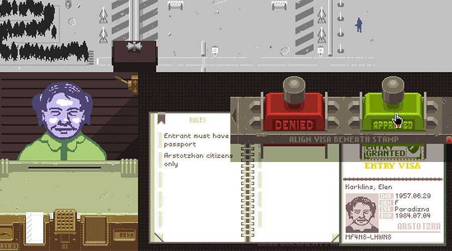 Это очень атмосферная пиксельная игра, в которой главное не геймплей (довольно монотонный, как положено пограничнику), а атмосфера. Через вас проходят десятки людей, судьбу которых вы можете решить одной печатью. Пойдете на нарушения инструкции ради спасения жизни? Или примкнете к революционной организации, пропустив бомбиста на территорию участка? Выбор за вами.
