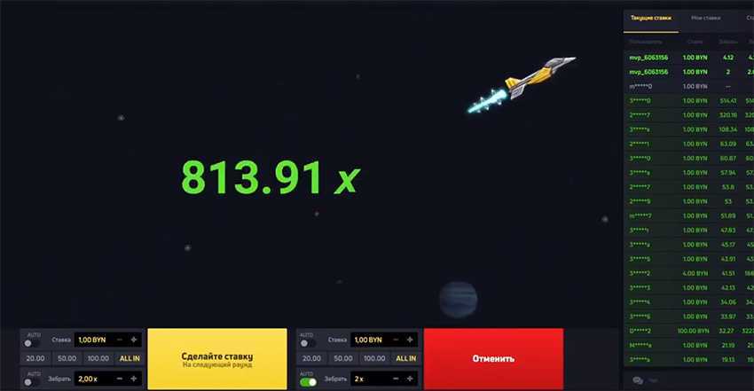 Слева от игрового поля можно видеть панель ставок в реальном времени. Здесь отображается информация о том, сколько игроков сделали ставки на текущий раунд игры, размеры ставок, на каких коэффициентах они обналичили выигрыши и сколько в результате выиграли. Здесь же можно видеть информацию о своих ставках и игровую статистику по топ-игрокам.