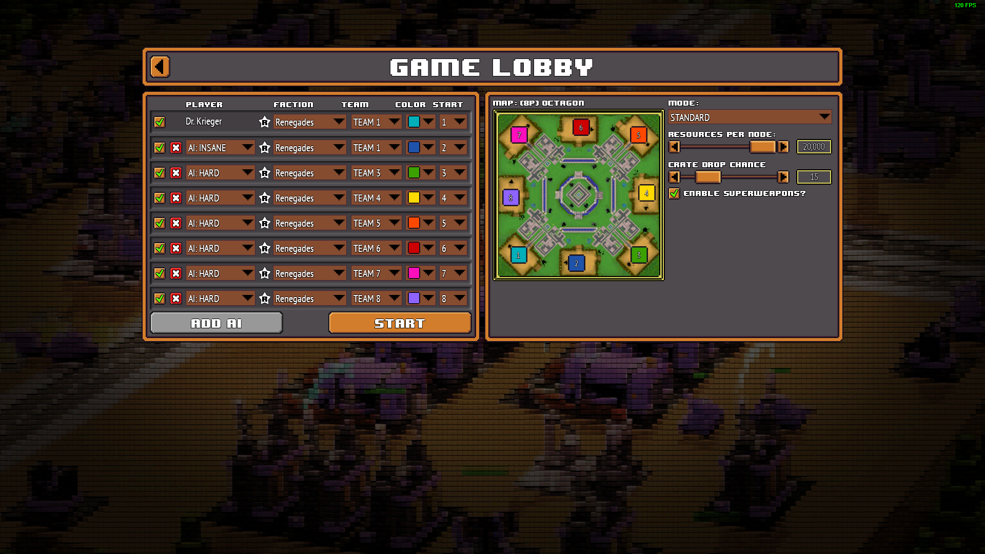 For starters, you’re going to have to pick a map that supports 8 players, obviously –though if you can find a community-made map that supports 7 players that you really like for some peculiar reason, go ahead. The best map that I would recommend is Octagon, it’s one of the official maps. I would crank up the resources per node to its max (i.e. 20,000). Feel free to do whatever you want for Crate Drop Chance, that simply dictates the probability of crates spawning whenever a random building/structure/object is destroyed, such as a house, car, apartment building, etc. The crates can potentially contain neat bonuses like random units (some which may not even be from your faction!), heal your existing units in close proximity, grant an immediate money bonus, etc., though they can also contain harmful effects, such as setting several of your units on fire (that are within close proximity to the crate), setting off a massive explosion, etc., so just think about it a bit before you start. (See the video further on in this guide for some examples of crates.)