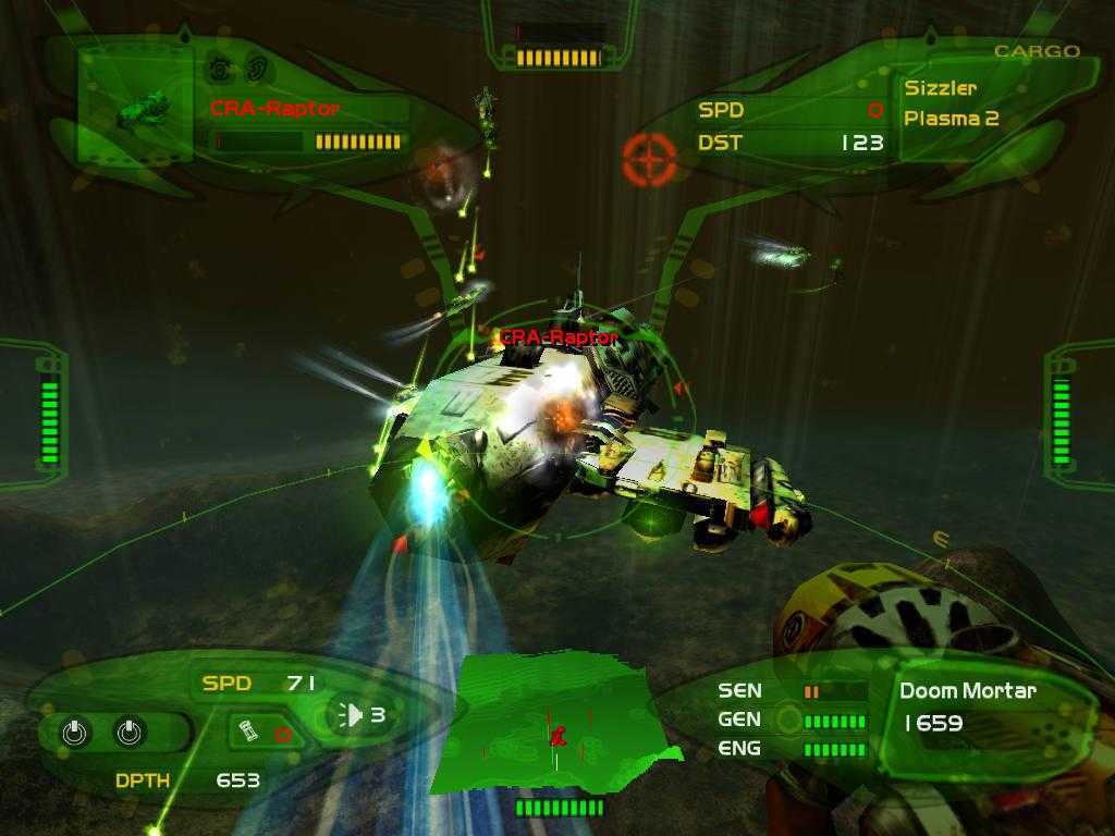 Самое смешное то, что ко всем трем применима одна и та же тактика: плыви бочком и зажимай гашетку! Хитрые маневры? Они не нужны. Враги очень вяло пытаются уйти от ваших нападок, а сами не способны сделать выстрел с упреждением или какой-нибудь резкий разворот, если мы говорим о живой фауне. Если они и попадают в вас, то лишь потому, что нападают с нескольких сторон. Давят массой. И вертикальность локаций практически никогда себя не оправдывает, ибо 80% времени вы стреляете горизонтально. Целиться куда-то вниз или вверх практически не приходится.