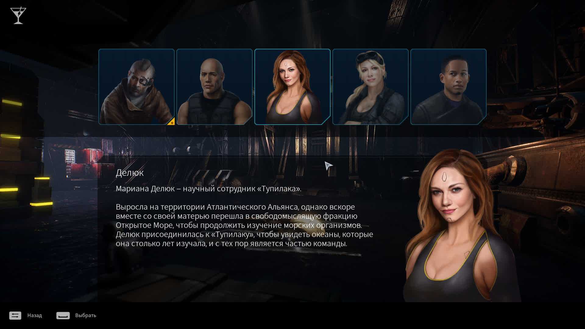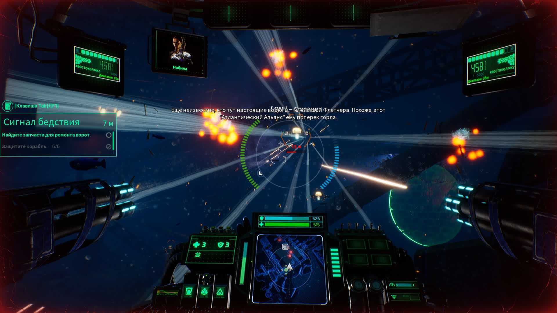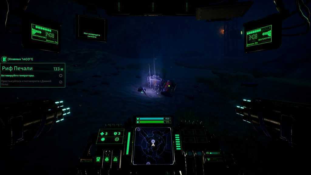 Ах да, диалоги. Голосовые и текстовые — с их помощью двигается сюжет. Персонажи немного общаются во время подводных «покатушек» и в хабах. И если во время покатушек ты хотя бы куда-то двигаешься и твои глаза заняты трехмерным миром, в хабе игра превращается в текстовое приключение. Просто читаешь диалоги, по бокам от которых размещены картинки с персонажами. Иногда даже дают выбрать вариант ответа, который не влияет на сюжет, но иногда может помочь с добычей апгрейдов и более глубоким погружением в историю. Честно говоря, было скучно. Даже несмотря на озвучку почти всех диалогов. Русскую озвучку. Поэтому я быстро читал и скипал, желая приступить к самому интересному.