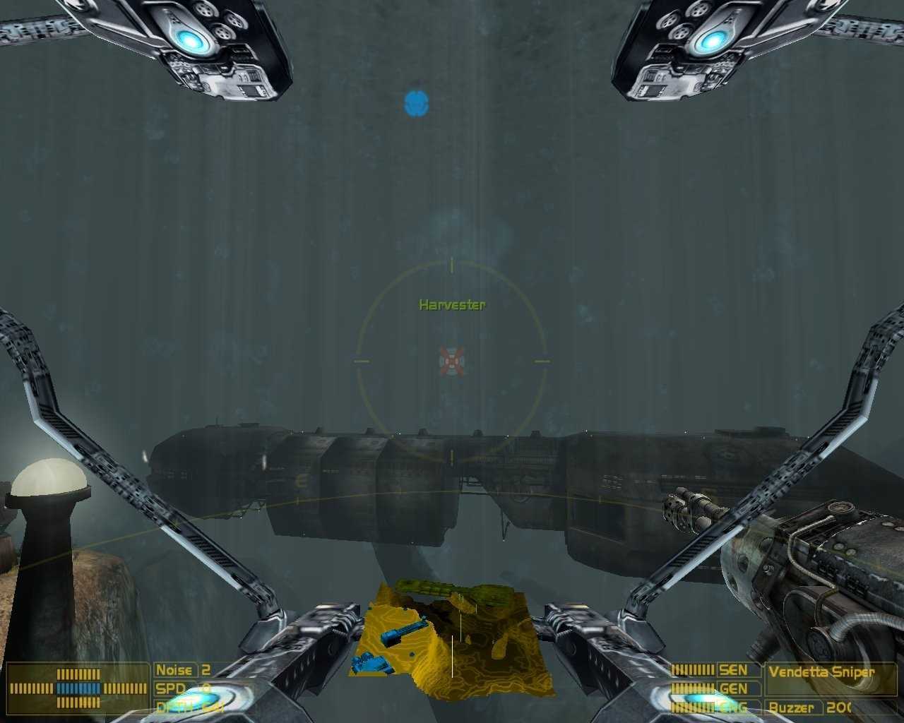 В Aquanox Deep Descent решили пойти по пути реализма. Так как все под водой, солнечный свет не проникает сквозь толщу воды и вокруг почти кромешная тьма, окутанная туманом. Видимость в районе 20-50 метров, ярких объектов почти нет. Даже фонарик, освещающий территорию в 5 квадратных метров, не спасает от уныния. Словно тыкаешься пьяный ночью по неизвестным переулкам, не имея возможность ничего разглядеть. Добавили бы какие-то рифы, на дне чуток света прибавили — игра сразу бы преобразилась. Но нет, реализм не позволил.