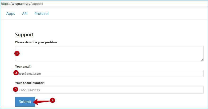 Там в окне Support есть поле Please, describe your problem. В нём постарайтесь максимально подробно описать проблему, а также добавьте контактные данные — адрес электронной почты и номер телефона, который использовался для регистрации в Telegram.