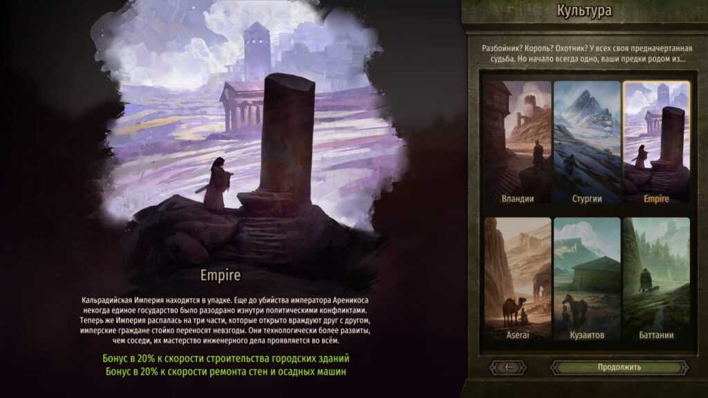 Выбор культуры зависит от предпочтительного стиля игры. Для заядлых торговцев подойдет культура «Асераи», для воинственных игроков – «Вландия» и «Кузаиты». Новичкам рекомендуется выбирать культуру «Асераи», поскольку это ускорит заработок золота на начальных этапах игры, тем самым облегчит прохождение. Также можно выбрать «Вландию», чтобы поскорее окунуться в пыл сражений за счет более быстрой прокачки солдат.