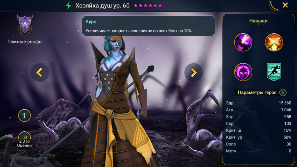 Еще один полезный герой из кампании. Один из лучших героев для арены в первый месяц игры. Аура Хозяйки Душ поможет вам обогнать противника, а 50% усиление атаки существенно увеличит урон. Также она будет полезна и на драконе. Там она не только поднимет атаку, но и снимет штрафы с команды.