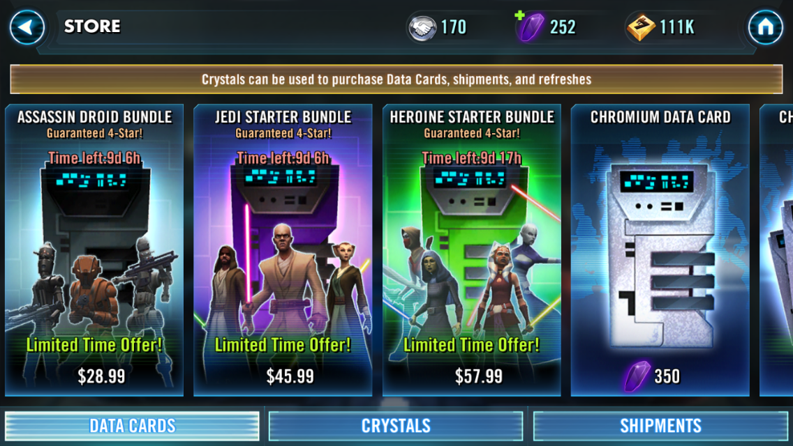 Покупки валюты всегда доступны в « Звездных войнах: Галактика Героев» , но это далеко не лучший способ получить прибыль. Во время игры вам периодически предлагают различные комплекты, которые доступны только в течение ограниченного времени. Они бывают самых разных цен и предложений, и если вы видите тот, который вам нравится, получите его. Это не только добавляет некоторых необходимых персонажей в ваш список, но вы также получаете тренировочных дроидов и кредиты, необходимые для завершения учебного процесса. Достаточно наград даже в небольшом пакете, чтобы максимизировать нескольких ваших персонажей в начале игры (по крайней мере, настолько, насколько они могут достичь в этот момент), что делает сражения намного проще для завершения.