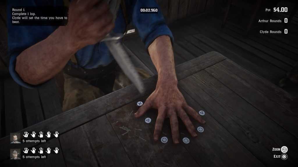 Лучший способ выиграть – это удерживать R2/RT, когда ваш противник возьмет нож – он всегда будет начинать первым – и наблюдать за последовательностью движений, потому что вам придется ее повторить. В начале все будет достаточно легко, что-нибудь типа X, Треугольник, X, Треугольник, X, Треугольник и так далее, но вскоре последовательности станут более непредсказуемыми. После каждого попадания вам нужно будет ударить ножом около своего большого пальца, и для этого всегда нужно будет нажимать на X (или на A, если вы играете на Xbox One), так что остается только запомнить 5 других кнопок.