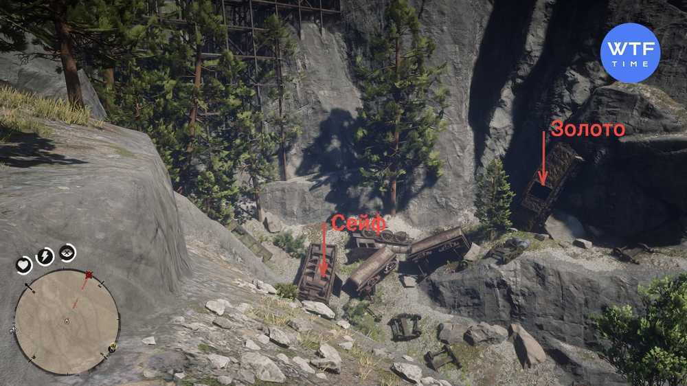 Начинать спуск к поезду удобнее всего с дороги на севере и постепенно двигаться вниз между двумя горами. Через опору моста вы сможете пройти пригнувшись.Пролезть в вагон с сейфом можно через открытую дверь, с золотом будет веселее.