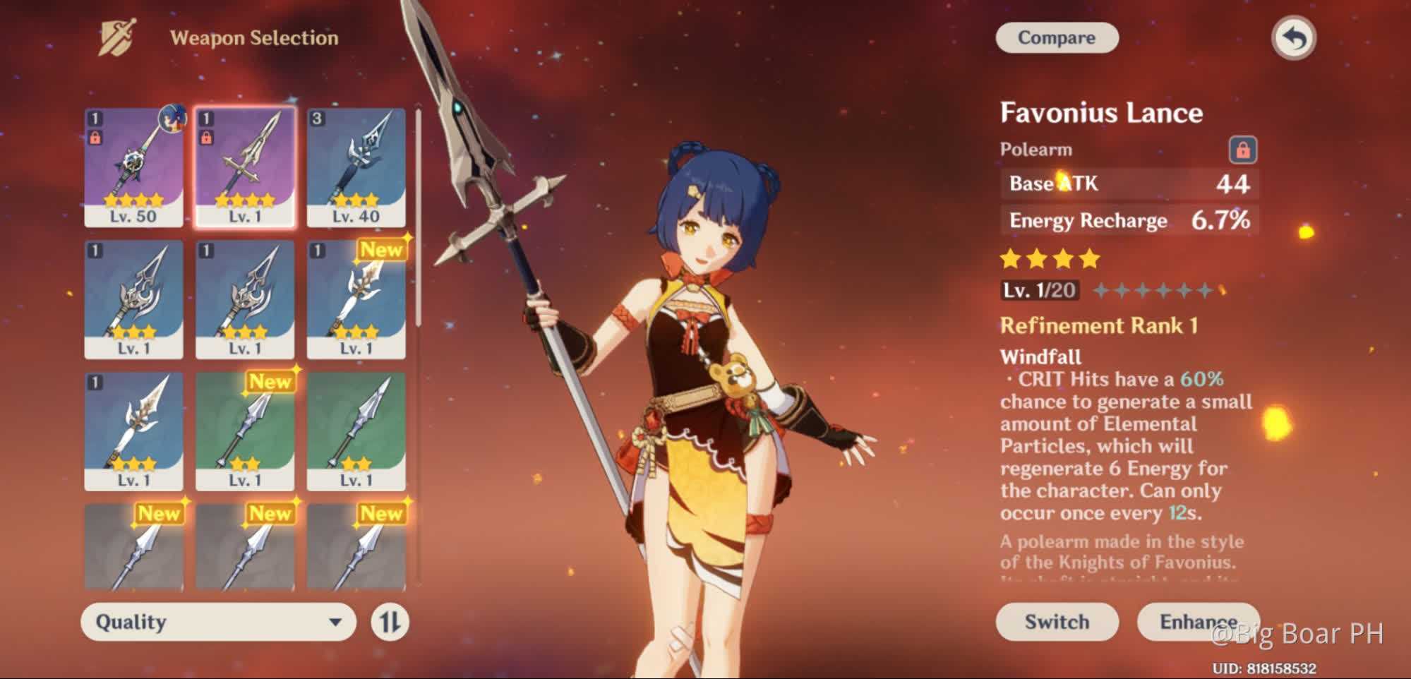 Копье Фавония — четырехзвзедочное древковое оружие с 44 единицами базовой атаки. Создает элементальные частицы во время критических атак с шансом от 60% до 100%. Эффект возникает раз в 12-6 секунд, а частицы восстанавливают 6 единиц энергии. Используйте это оружие, если Сегун Райден отыгрывает роль второстепенного дамагера и нуждается в пополнении энергии. Ну или если ваш отряд страдает от недостатка энергии и вы готовы пожертвовать атакующими возможностями Сегун Райден.