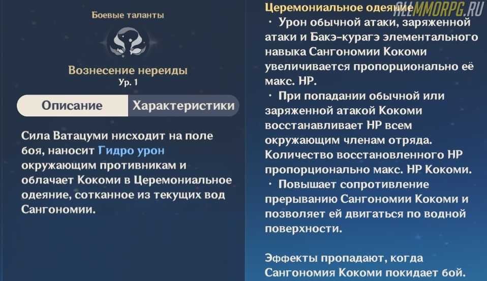 - Вознесение нереиды (взрыв стихий). Кокоми наносит урон магией воды (Гидро) и облачается в Церемониальное одеяние. С его помощью у вашей героини увеличивается урон от всех видов атак пропорционально максимальному здоровью Кокоми, а успешное попадание по врагу восстанавливает здоровье у всех союзников. Помимо этого, вы сможете ходить по воде. Церемониальное одеяние будет активировано, пока вы не смените героя.