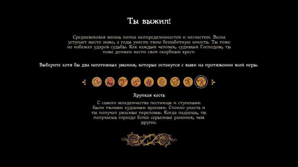 На заметку: если не хотите мучиться сильно, то лучше всего брать «Глисты» и «Сомнамбула». Они по сравнению с остальными безобидны. А в целом, я боялся в начале игры брать все отрицательные умения. Думал что и вправду будет жестко. Но оказалось не так уж и страшно, да и соблазн выполнить редкое достижение в KC высок.