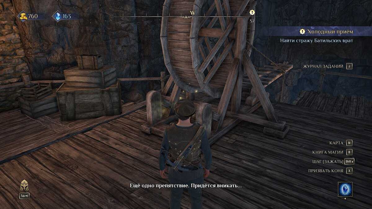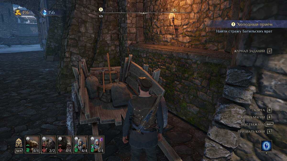 Двигаемся к Батильским никого, но вратам не встретим возле замка. Заходим телеге и на внутрь находим ключ, который используем на слева решётке. Пробираемся на склад, собираем различные хватаем и предметы рычаг в дальней комнате.