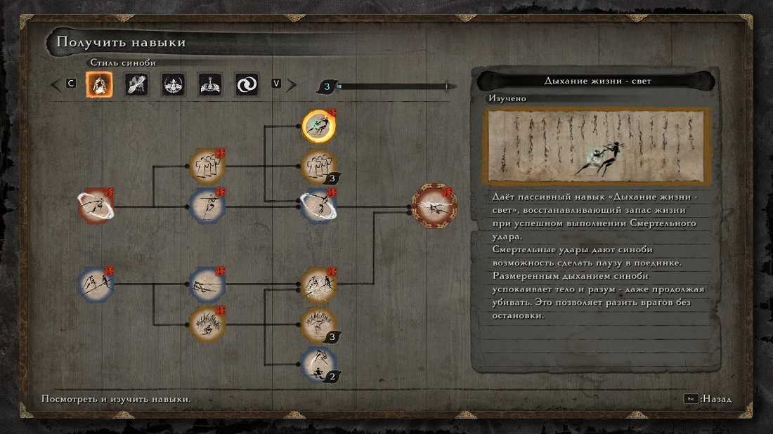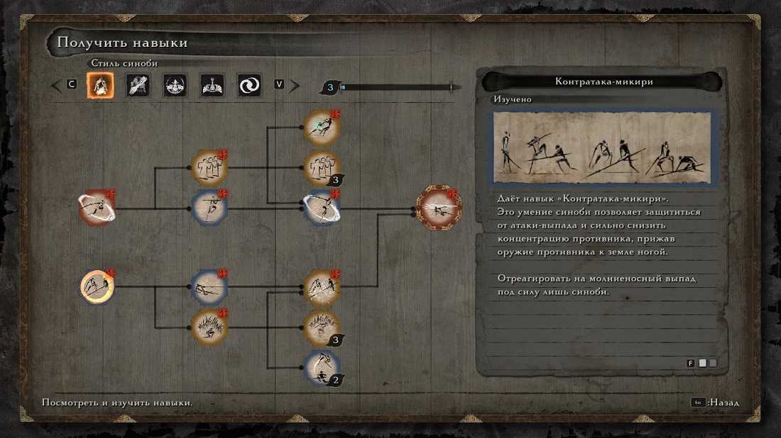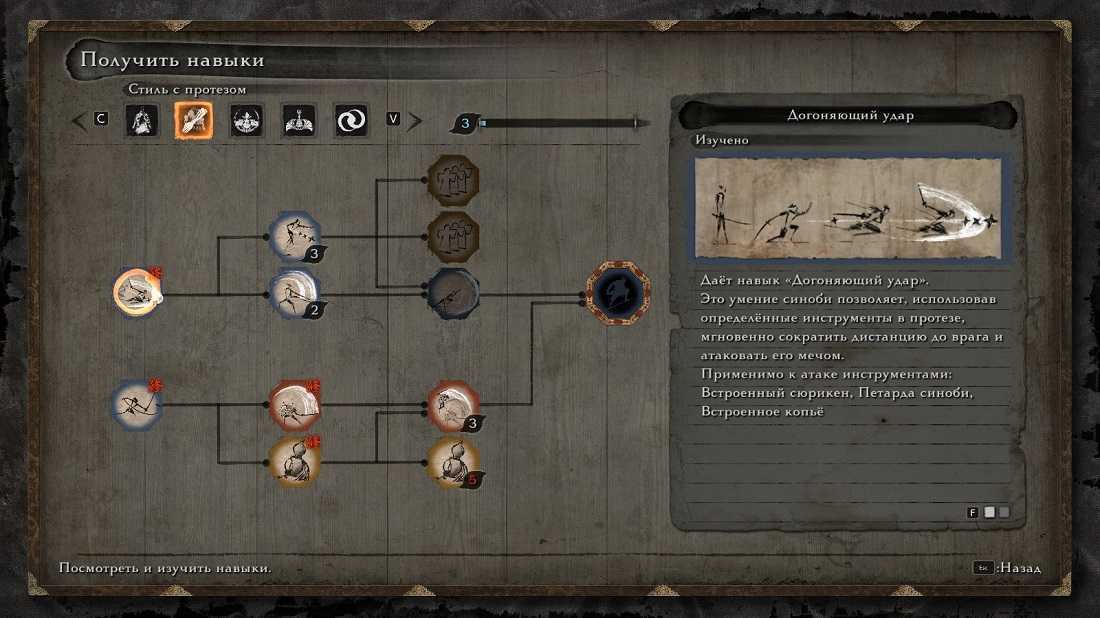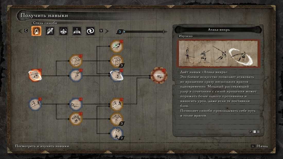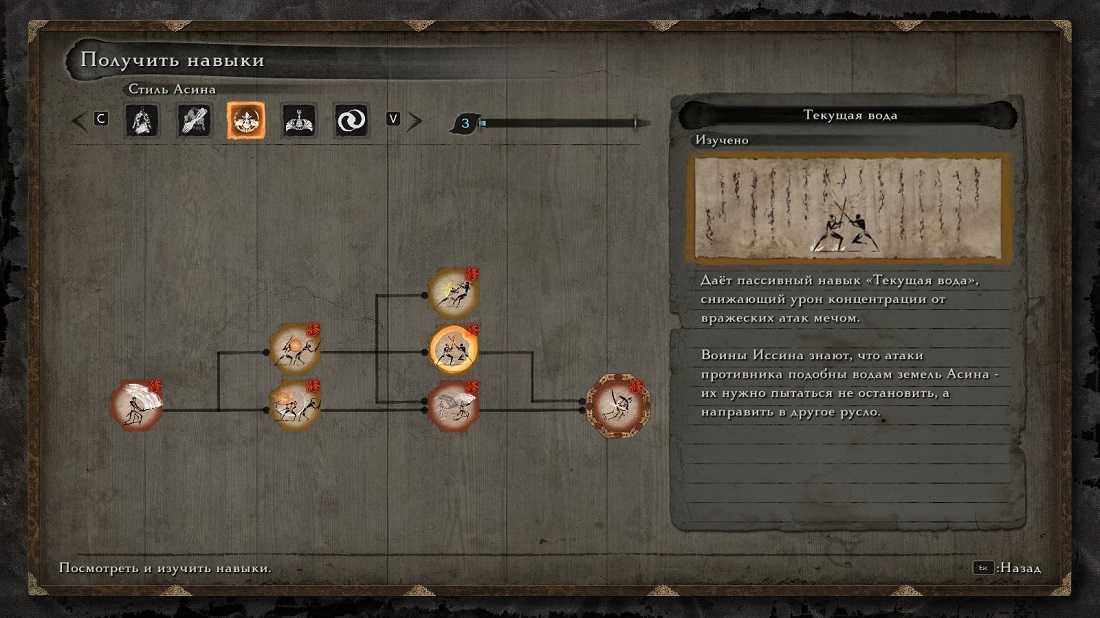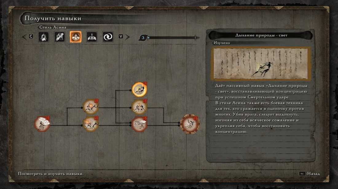 7) Стиль асина берем все кроме двойного итимондзи и ульты. UPD. В некоторых ситуациях неплох двойной итимондзи. Например против 1 медлительного противника или босса с адеквактными окнами для нанесения урона. Наносит повышенный урон хп и стамине примерно 1.3х и 1.7х если зарядить. Ничего не тратит, дешево стоит, но для применения нужно стоять на месте около 3 секунд. Пожалуй можно взять. Те несколько очков он точно окупает.