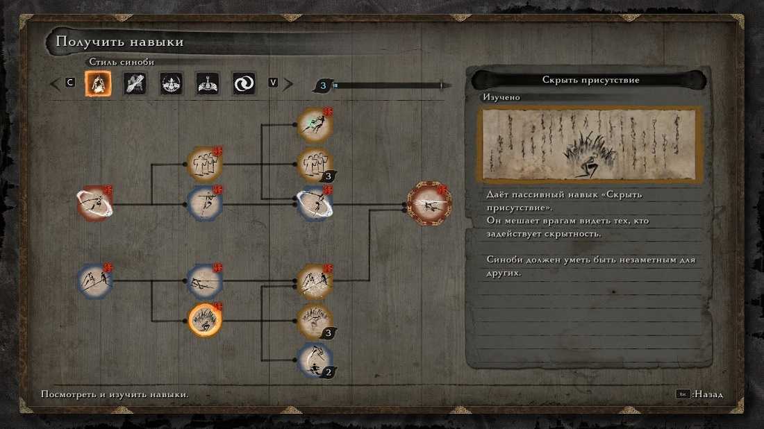 - Тайное учение стиля Мусин — Выдаёт Эмма\Иссин\Тэнгу как только вы вкачаете финальный навык в любом учении.