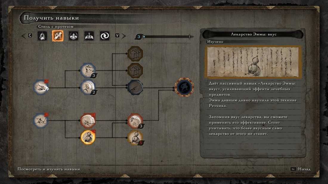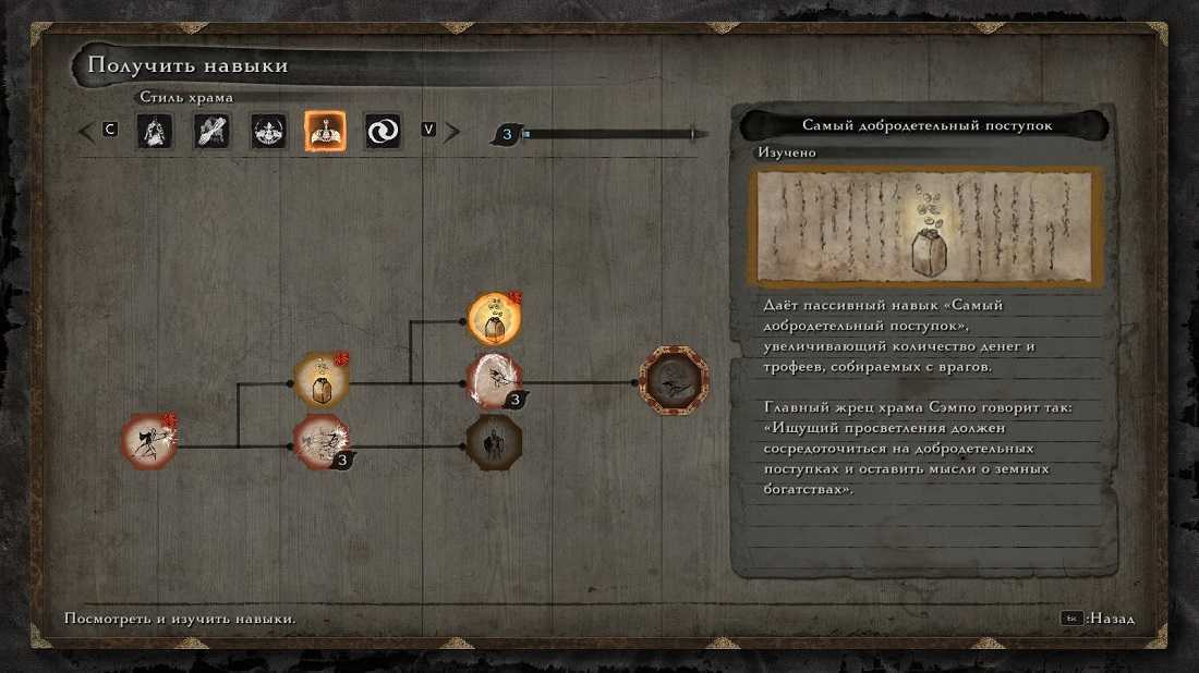 Получаем стиль храма и берем добродетельный поступок и самый добродетельный поступок. Без преувеличения самые полезные навыки в игре, так как без них прокачать протез и нафармить красные и синие леденцы крайне проблематично (фармятся в храме сразу от первого костра).