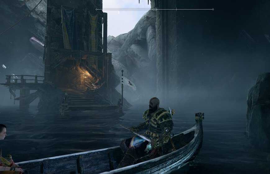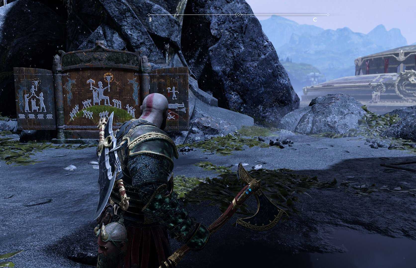- Чтобы найти тайник, найдите причал у Смотровой башни. Поднимитесь на верхушку, потом с помощью канатного спуска очутитесь на соседней вышке – там будет храм йотунов. Тайник будет зарыт справа, около камней.