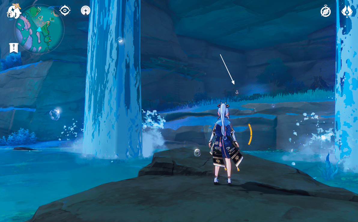 - Активируйте столб гидро элемента с помощью умения гидро или атаки Барбары, чтобы появился скрытый драгоценный сундук. Используйте навыки Кэйя или гео ГГ, чтобы добраться до столба.