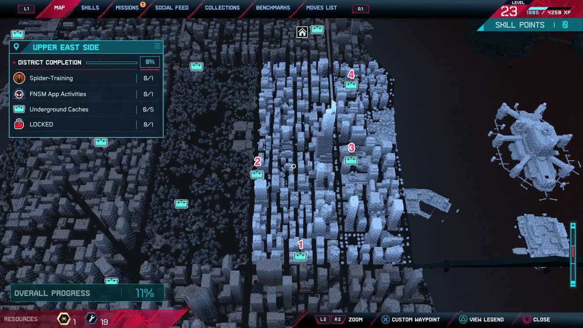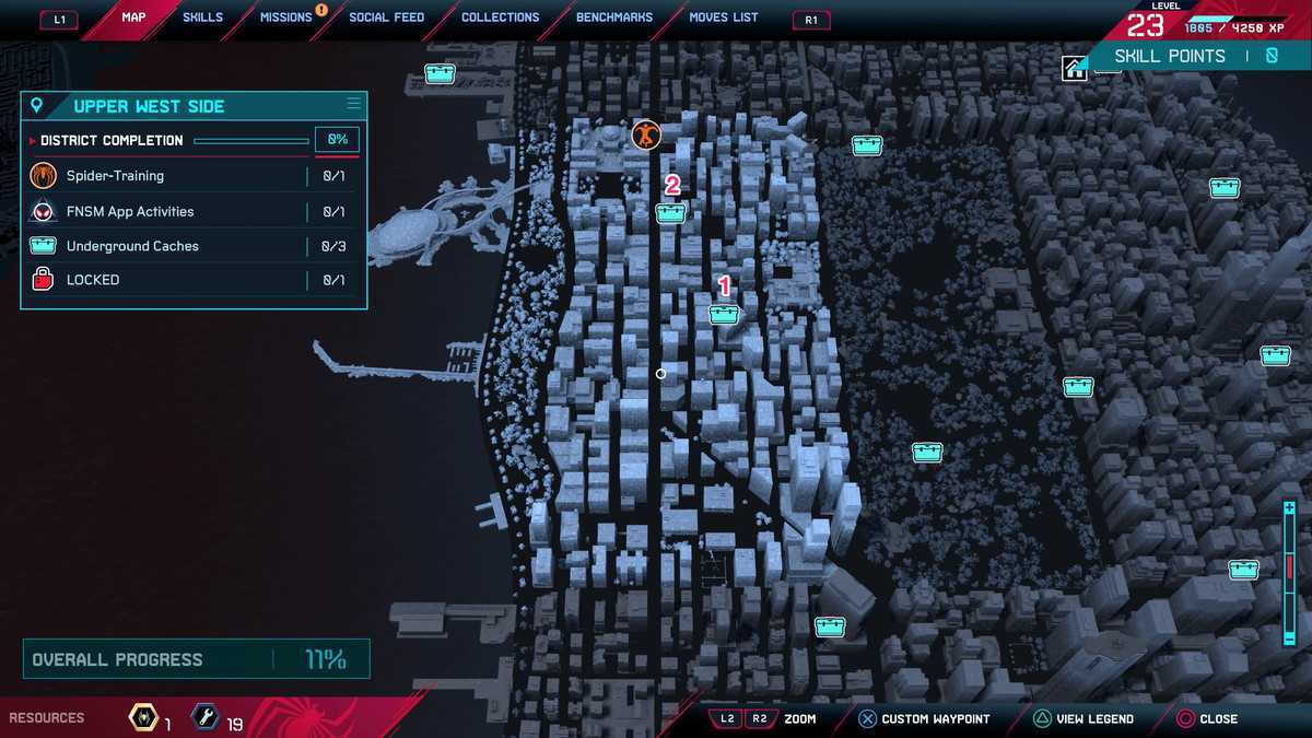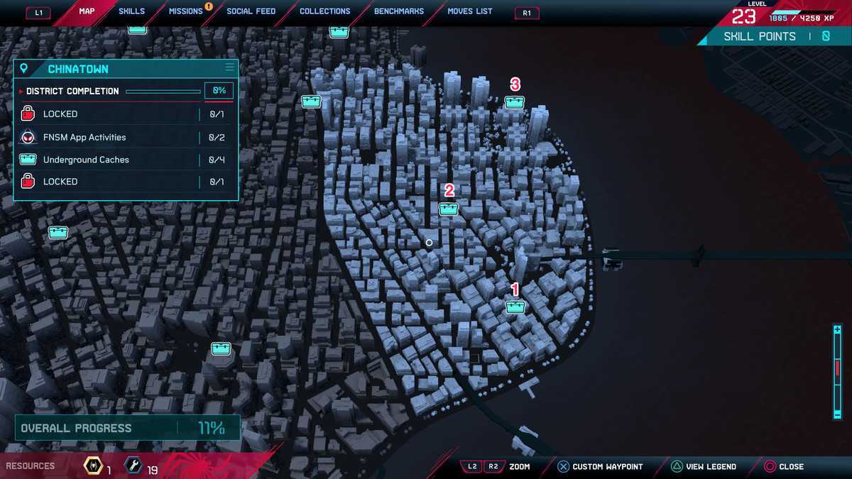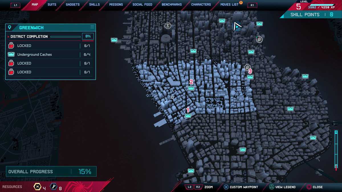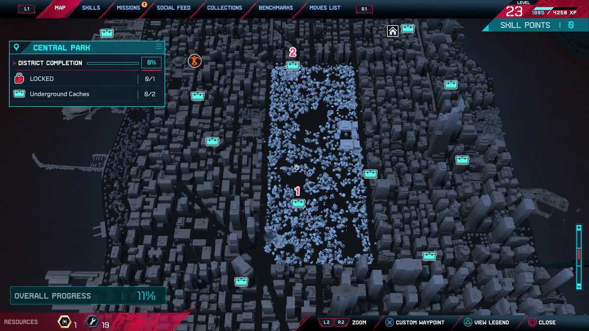 Советую, сначала пройти сюжетную часть, потому что многие предметы коллекционирования и костюмы заблокированы. После прохождения сюжета, лучше по порядку зачищать район за районом. Всё что заблокировано связано с прогрессом сюжета, побочных заданий и предметами коллекционирования. Откройте все Радиовышки, которые по умолчанию отмечены на карте, чтобы открыть местоположения всех коллекционных предметов.