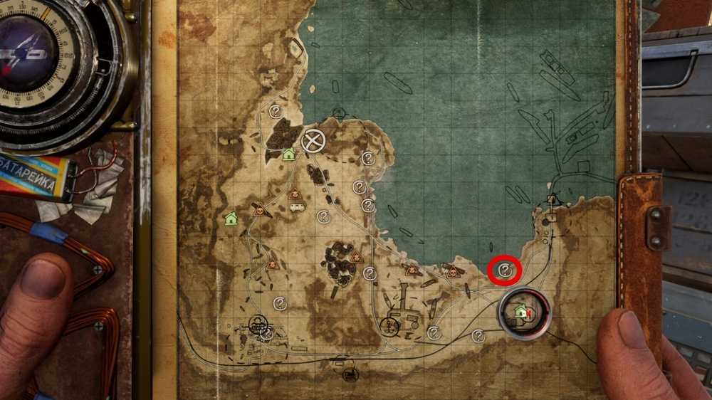 - Когда встретитесь с Дамиром по сюжету игры, около Источника воды, то спуститесь вниз и чуть левее увидите небольшое ржавое судно (точнее, его верхнюю часть). Войдите в кабину и снимите открытку со стены.